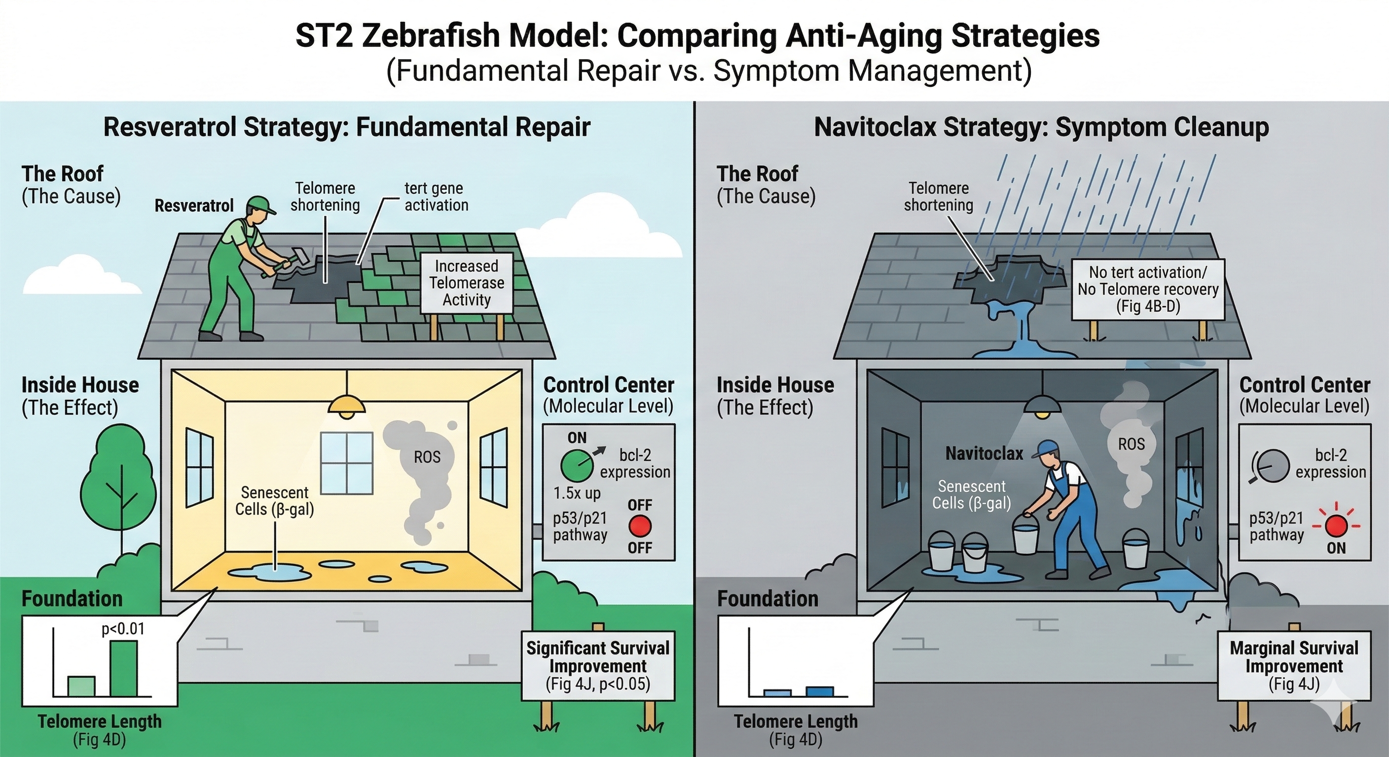 이번 연구는 단지 새로운 동물 모델을 개발한 것을 넘어, 노화 치료 전략에 대한 중요한 통찰을 제공합니다. ST2 제브라피쉬 모델은 텔로미어 단축이 생존을 결정하는 핵심 요인일 때, 단순히 노화 세포를 제거하는 것만으로는 충분하지 않다는 것을 명확히 보여주었습니다. 근본 원인인 '짧아진 텔로미어'를 직접 해결하는 레스베라트롤과 같은 접근법이 더 효과적이었던 것입니다.