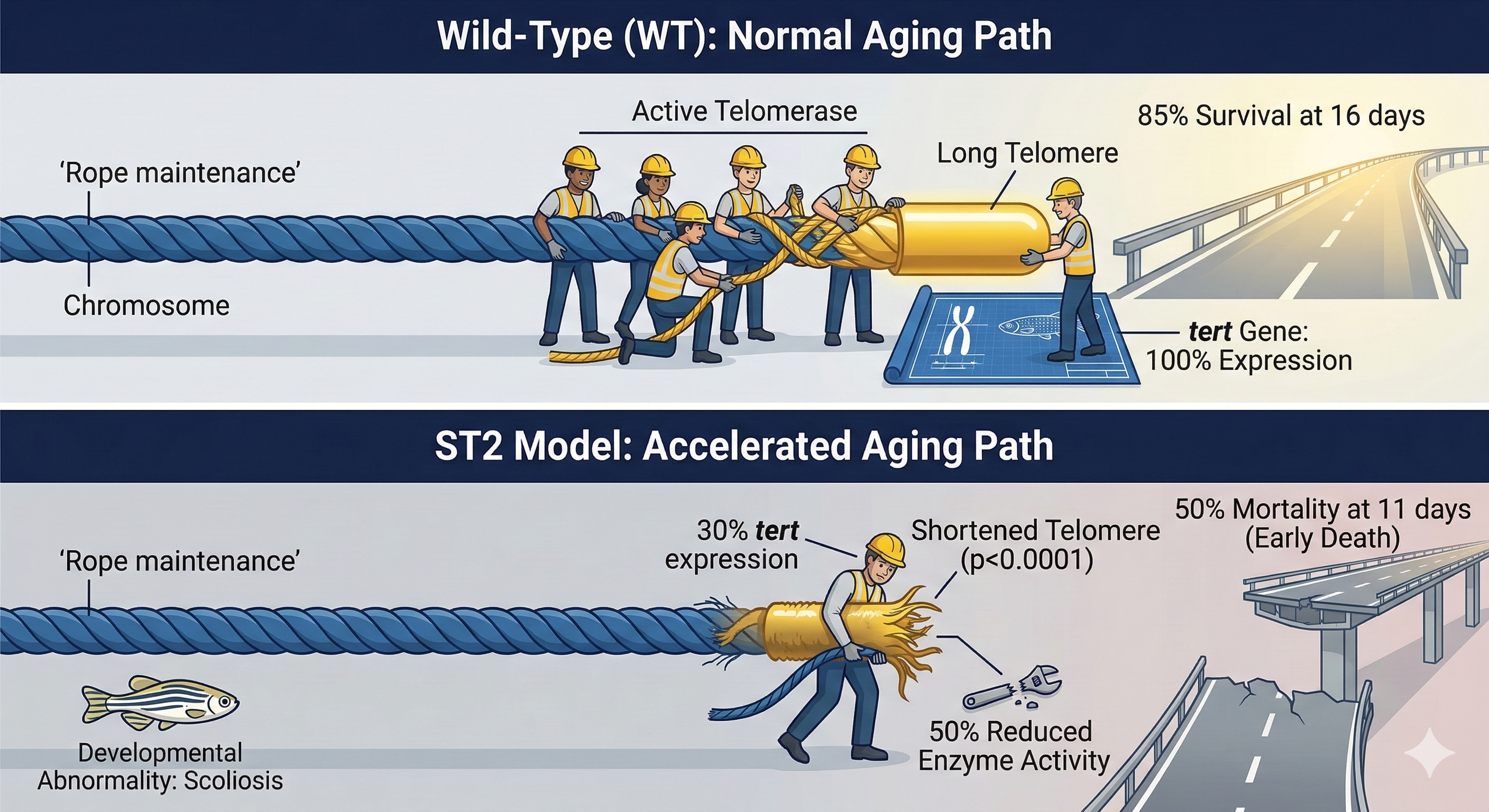 이러한 현상의 근본 원인은 텔로미어 유지 능력의 저하에 있었습니다. ST2 유충은 텔로머레이스 효소를 만드는 `tert` 유전자의 발현량이 정상 대비 약 30% 수준으로 급감했으며, 이로 인해 효소의 실제 활성도 역시 절반 수준으로 떨어졌습니다.
