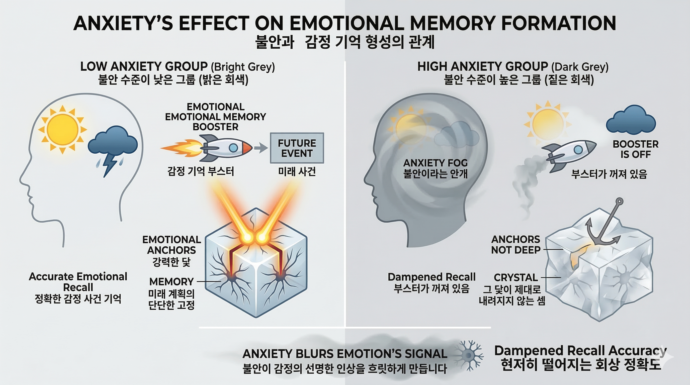 반면, 오른쪽 불안 수준이 높은 그룹에서는 이 '부스터'가 꺼져 있었습니다. 이들의 기억력은 감정의 종류와 상관없이 중립적인 사건을 기억할 때와 별 차이가 없었으며, 감정적 사건에 대한 회상 정확도는 불안이 낮은 그룹에 비해 현저히 떨어졌습니다. 마치 불안이라는 안개가 감정이 기억에 남기는 선명한 인상을 흐릿하게 만드는 것과 같습니다.