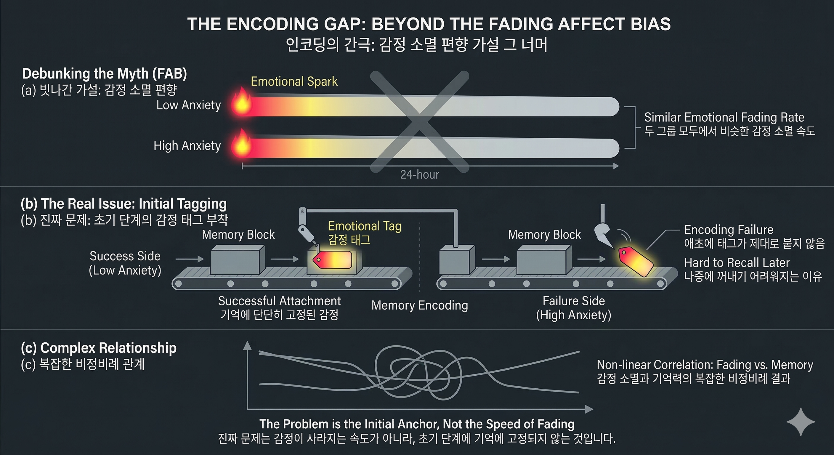 이는 불안한 사람들의 문제가 부정적인 감정을 더 오래 붙들고 있기 때문이 아닐 수 있음을 보여줍니다. 진짜 문제는 감정이 기억을 강화하는 '초기 단계'에 있을 가능성이 큽니다. 감정이란 태그가 애초에 기억에 제대로 붙지 않으니, 나중에 기억을 꺼내기도 어려워지는 것이죠. 또한 감정의 소멸 정도와 기억력 저하가 항상 정비례하지는 않는다는 복잡한 결과도 나타났습니다.