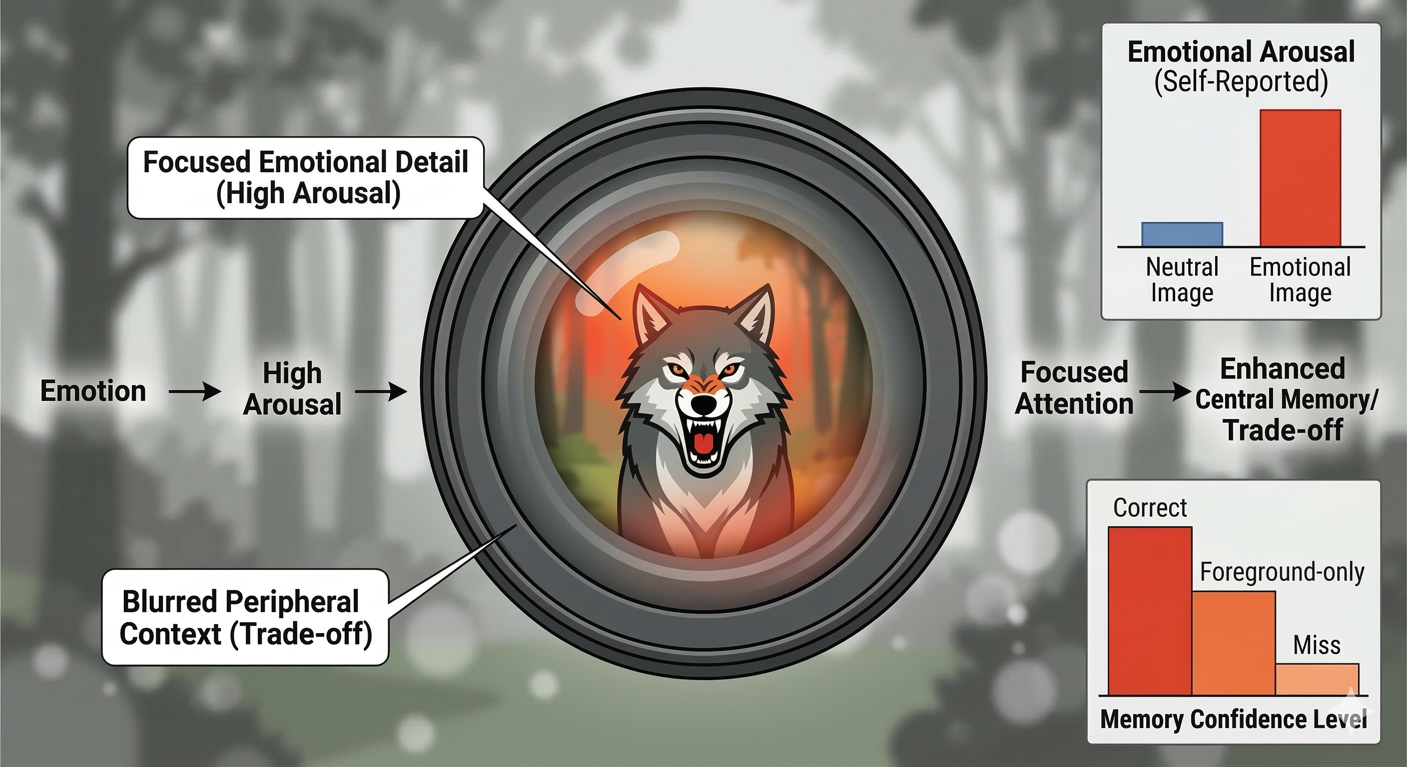감정이 기억에 미치는 영향은 마치 강력한 스포트라이트와 같습니다. 이 스포트라이트는 무대 중앙의 배우(전경)를 환하게 비추는 대신, 주변 무대장치(배경)는 어둠 속에 잠기게 만듭니다. 실제로 데이터는 이러한 '기억의 트레이드오프'를 명확히 보여줍니다.