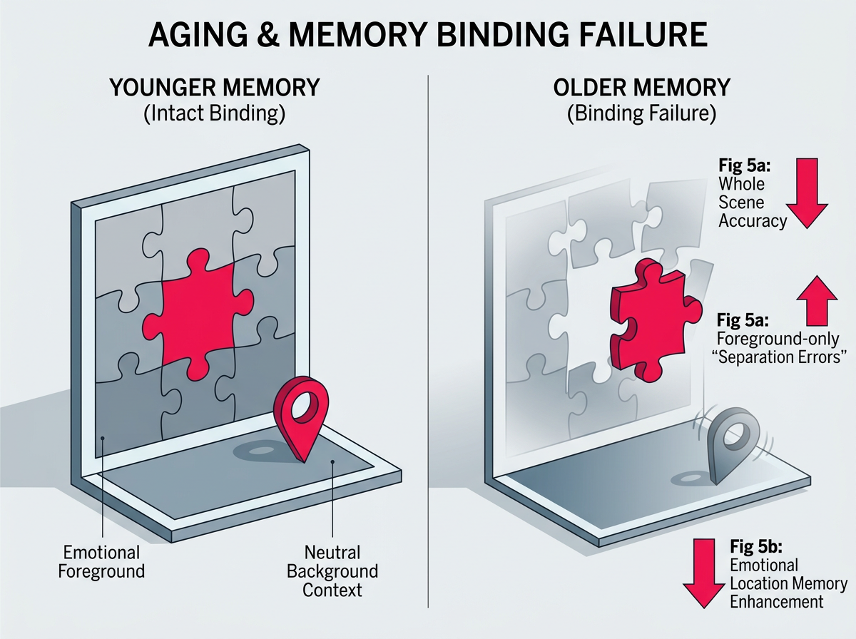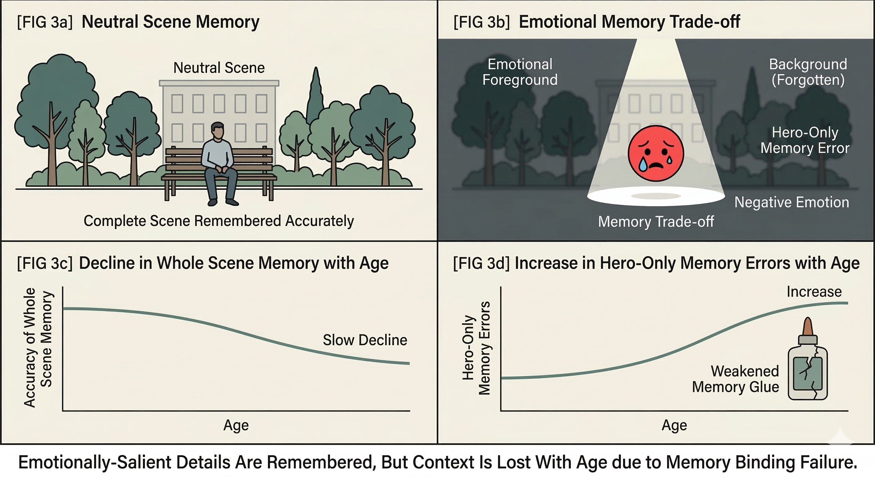 하지만 더 흥미로운 점은 기억 실패의 '유형'입니다. 노년층은 배경은 잊고 감정적인 전경만 기억하는 '분리 오류'를 젊은 층보다 더 많이 범하는 경향을 보였습니다. 이는 마치 오래된 사진첩에서 사진 속 인물만 오려내고 배경은 버리는 것과 같습니다. 나이가 들수록 기억의 접착력이 약해져 감정적으로 중요한 조각만 남고 맥락은 사라지는 것입니다.