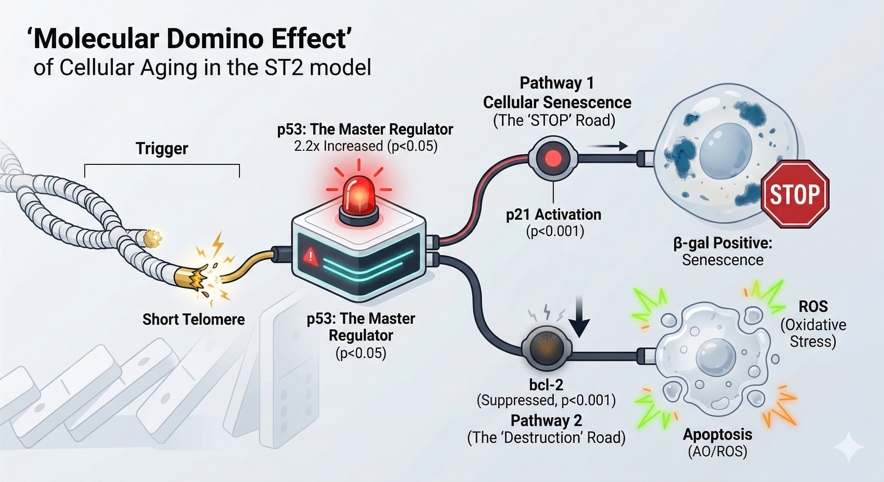 종합하면, 짧아진 텔로미어가 `p53` 경로를 활성화시켜 세포 노화와 사멸을 촉진하는 '도미노 효과'를 일으킨 것입니다.