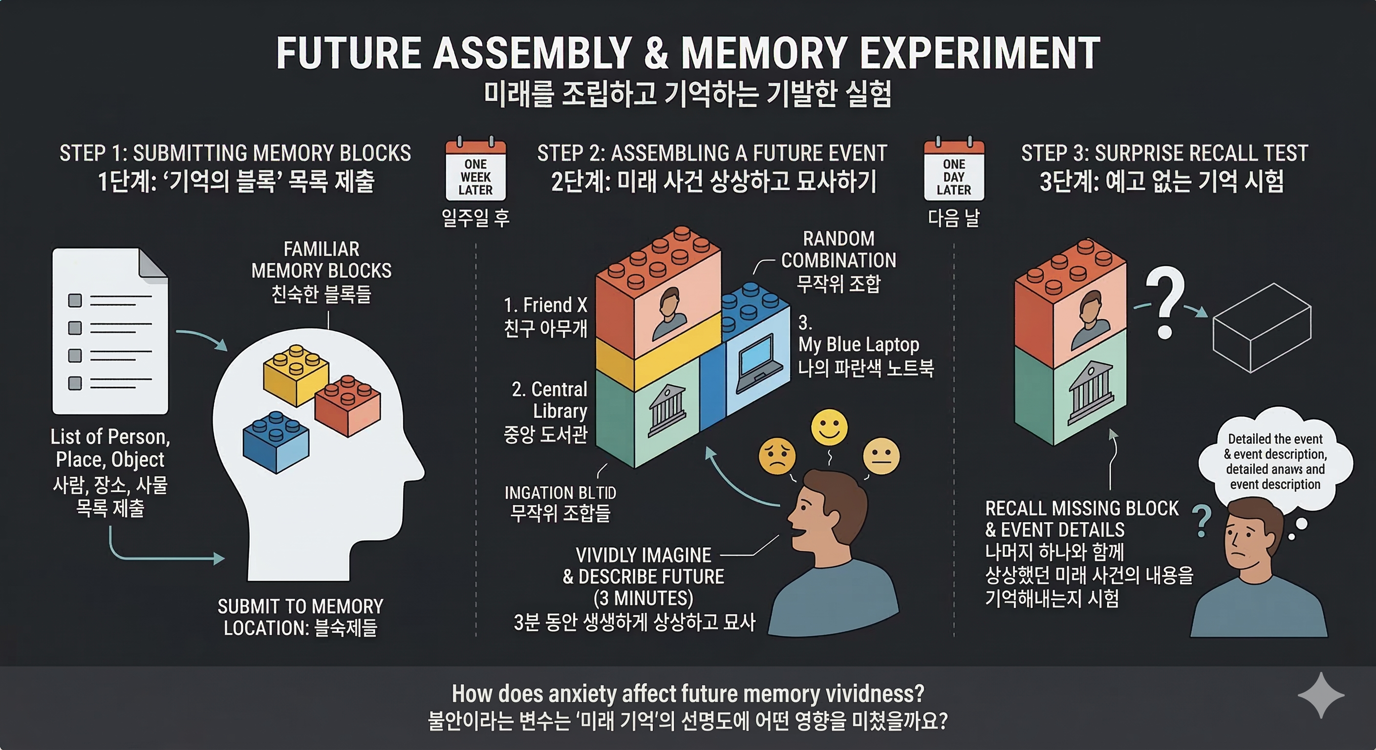 일주일 후, 연구팀은 이 '기억의 블록' 세 개(예: 친구 아무개, 중앙 도서관, 나의 파란색 노트북)를 무작위로 조합해 제시하며 긍정적, 부정적, 또는 중립적인 미래 사건을 3분 동안 생생하게 상상하고 묘사하도록 요청했습니다.