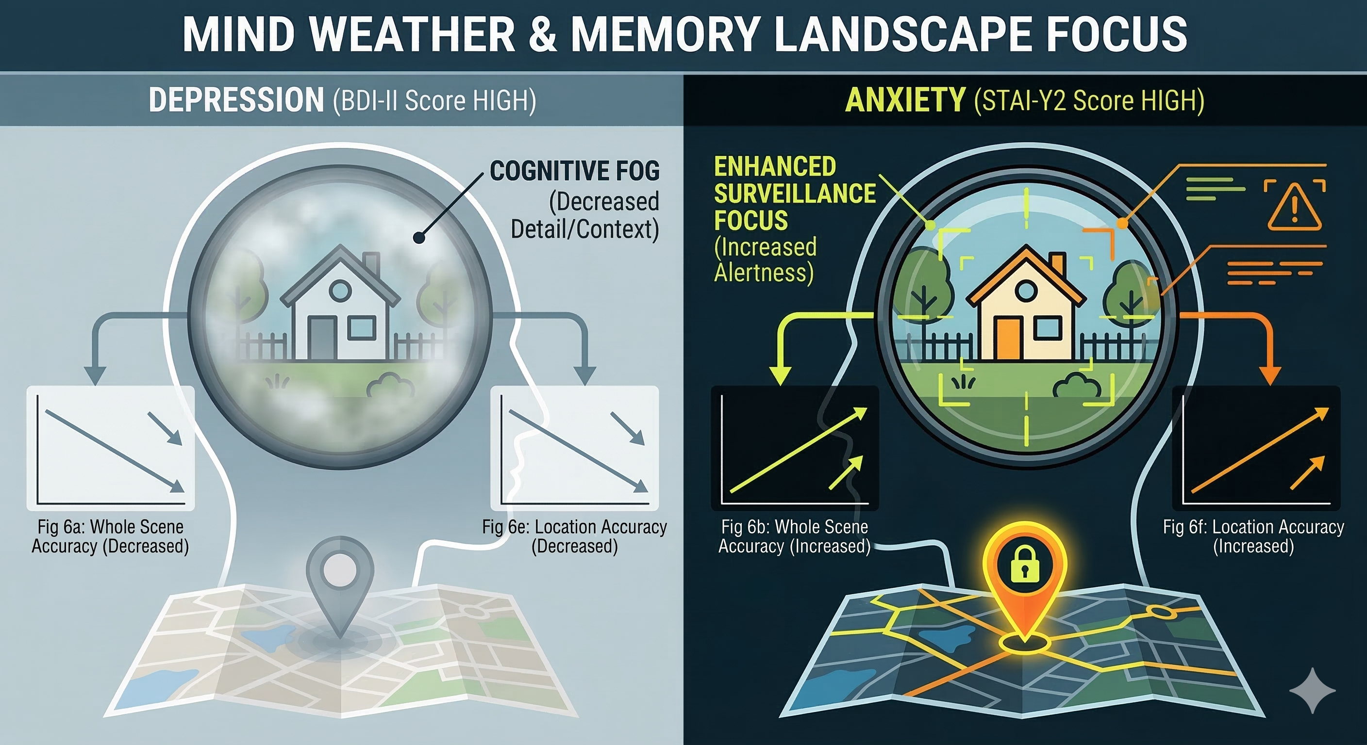 더 나아가, 연구진은 개인의 기분 상태가 기억의 풍경을 어떻게 바꾸는지 탐색했습니다. 우울감(BDI-II)은 마치 기억에 안개가 낀 것처럼 작용했습니다. 우울 점수가 높을수록 전체 장면을 정확히 기억하는 능력(그림3-2 왼쪽)과 그 장면이 나타난 위치를 기억하는 정확도가 모두 유의미하게 감소했습니다. 이는 우울한 마음 상태가 기억의 세부 사항과 공간적 맥락을 모두 흐릿하게 만드는 인지적 안개와 같음을 시사합니다.